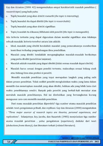 Gay dan Airasian (2000: 42) mengemukakan empat karakteristik masalah penelitian (