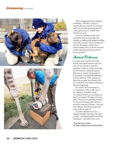 Left, bottom: A giraffe presents its hoof to be trimmed.