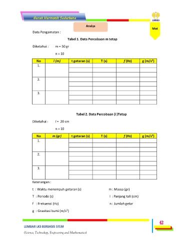 No m (gr) t getaran (s) T (s) f (Hz) g (m/s )