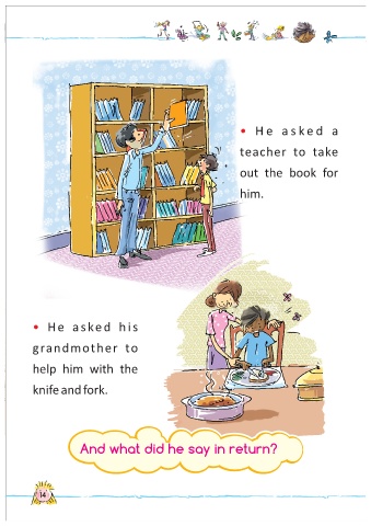 • H e a s k e d a teacher to take out the book for him. • He asked his grandmother to help him with the knife and fork. And what did he say in return? 14