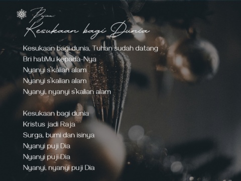 Kesukaan bagi dunia, Tuhan sudah datang Bri hatiMu kepada-Nya Nyanyi s’kalian alam Nyanyi s’kalian alam Nyanyi, nyanyi s’kalian alam Kesukaan bagi dunia Kristus jadi Raja Surga, bumi dan isinya Nyanyi puji Dia Nyanyi puji Dia Nyanyi, nyanyi puji Dia