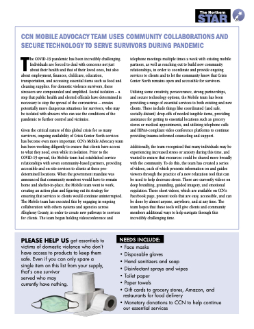 Given the critical nature of this global crisis for so many survivors, ongoing availability of Crisis Center North services has become even more important. CCN’s Mobile Advocacy team has been working diligently to ensure that clients have access to what they need, even while in isolation. Prior to the COVID-19 spread, the Mobile team had established service relationships with seven community-based partners, providing accessible and on-site services to clients at these pre- determined locations. When the government mandate was announced that community members would have to remain home and shelter-in-place, the Mobile team went to work, creating an action plan and figuring out its strategy for ensuring that services to clients would continue uninterrupted. The Mobile team has executed this by engaging in ongoing collaboration with others systems and agencies across Allegheny County, in order to create new pathways to services for clients. The team began holding videoconference and