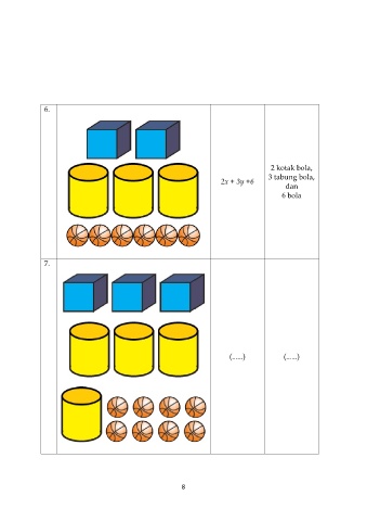 6. 2 kotak bola, 3 tabung bola, 2x + 3y +6 dan 6 bola 7. (......) (......) 8