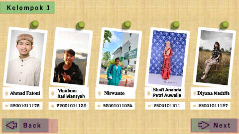 K e l o m p o k 1 Maulana Shofi Ananda Ahmad Fatoni Nirwanto Diyana Nadzifa Radiviansyah Putri Auwalia 22001011175 22001011138 22001011024 2200101211 22001011127 B a c k N e x t