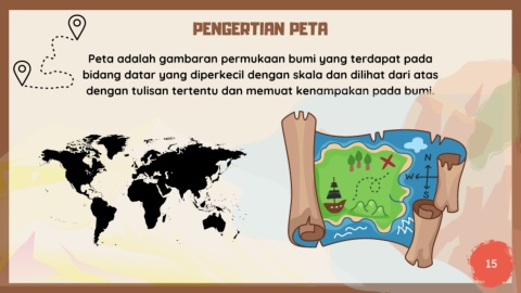 PENGERTIAN PETA Peta adalah gambaran permukaan bumi yang terdapat pada bidang datar yang diperkecil dengan skala dan dilihat dari atas dengan tulisan tertentu dan memuat kenampakan pada bumi. 15