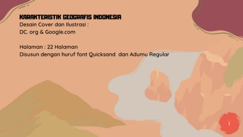 KARAKTERISTIK GEOGRAFIS INDONESIA Desain Cover dan Ilustrasi : DC. org & Google.com Halaman : 22 Halaman Disusun dengan huruf font Quicksand dan Adumu Regular i