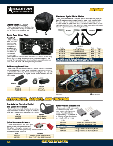 Front motor plates for SB Chevy are offered in one and two piece de- signs. One piece versions mount using the lower front mounting holes. Two piece sets use the lower front mount holes and the water pump mounting holes. All plates have 19-1/2" center-to-center chassis mount- ing holes. ALL38128/38129 and ALL38145 plates come with bushings to allow for engine flex and help with weight transfer.