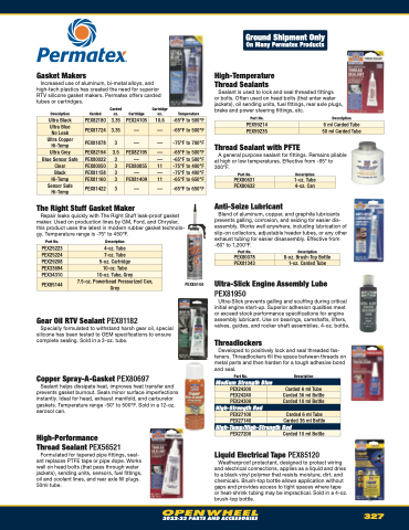 Increased use of aluminum, bi-metal alloys, and high-tech plastics has created the need for superior RTV silicone gasket makers. Permatex offers carded tubes or cartridges.