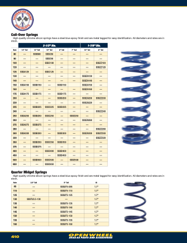 High-quality chrome silicon springs have a steel blue epoxy finish and are metal tagged for easy identification. All diameters and rates are in stock.
