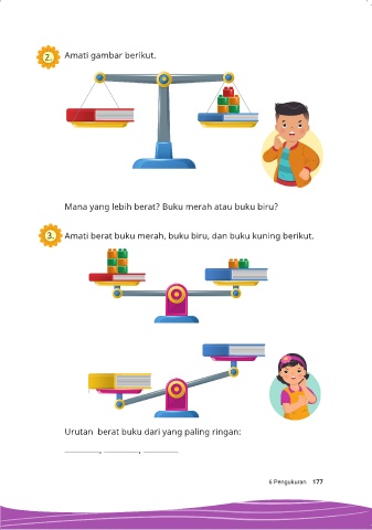 2. 2. Amati gambar berikut. Mana yang lebih berat? Buku merah atau buku biru? 3. 3. Amati berat buku merah, buku biru, dan buku kuning berikut. Urutan berat buku dari yang paling ringan: , , 6 Pengukuran 177