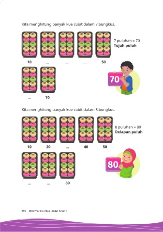 Kita menghitung banyak kue cubit dalam 7 bungkus. 7 puluhan = 70 Tujuh puluh 10 ... ... ... 50 70 ... 70 Kita menghitung banyak kue cubit dalam 8 bungkus. 8 puluhan = 80 Delapan puluh 10 20 ... 40 50 80 ... ... 80 196 Matematika untuk SD/MI Kelas II