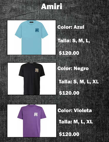 Amiri Color: Azul Talla: S, M, L, $120.00 Color: Negro Talla: S, M, L, XL $120.00 Color: Violeta Talla: M, L, XL $120.00