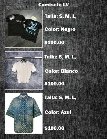 Camiseta LV Talla: S, M, L, Color: Negro $100.00 Talla: S, M, L, Color: Blanco $100.00 Talla: S, M, L, Color: Azul $100.00