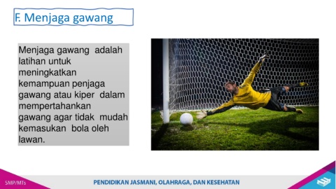F. Menjaga gawang Menjaga gawang adalah latihan untuk meningkatkan kemampuan penjaga gawang atau kiper dalam mempertahankan gawang agar tidak mudah kemasukan bola oleh lawan.