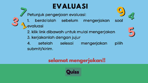 EVALUASI Petunjuk pengerjaan evaluasi: 1. berdo'alah sebelum mengerjakan soal evaluasi 2. klik link dibawah untuk mulai mengerjakan 3. kerjakanlah dengan jujur 4. setelah selesai mengerjakan pilih submit/kirim. selamat mengerjakan!! Quiss Quiss
