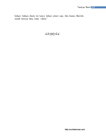 TereLiye “Bumi” 316 belajar bahasa dunia ini hanya dalam sehari saja. Dan kamu, lihatlah, masih berusia lima belas tahun.” http://cariinformasi.com