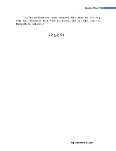 TereLiye “Bumi” 371 “Aku lupa memberitahu, Tamus membawa Buku Kematian ke lorong gelap tadi. Bagaimana kalau buku itu dikuasai oleh si Tanpa Mahkot a. Bukankah itu berbahaya?” http://cariinformasi.com