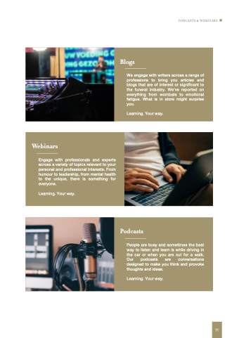 We engage with writers across a a a a a a range of of professions to to bring you articles and blogs that are of of interest or or significant to to the funeral industry We've reported on on everything from wombats to to emotional fatigue What is is in in store might surprise you Learning Your way Webinars