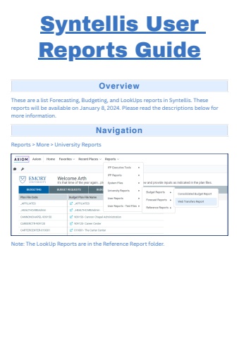 Syntellis UserReports GuideThese are a list Forecasting, Budgeting, and LookUps reports in Syntellis. Thesereports will be available on January 8, 2024. Please read the descriptions below formore information.Reports > More > University ReportsNote: The LookUp Reports are in the Reference Report folder.OverviewNavigation