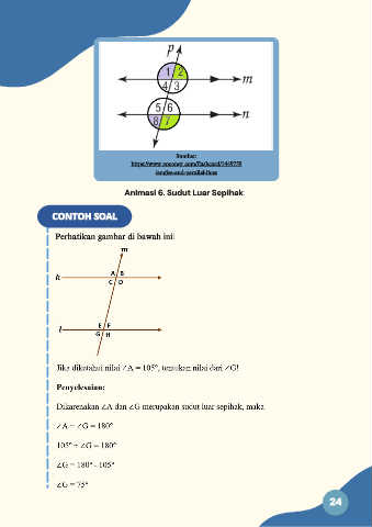 Sumber: https://www.goconqr.com/flashcard/1449759 /angles-and-parallel-lines Animasi 6. Sudut Luar Sepihak CONTOH SOAL Perhatikan gambar di bawah ini! 24