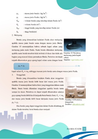 kapal selam F = w sehingga massan jenis benda sama dengan massa jenis fluida.