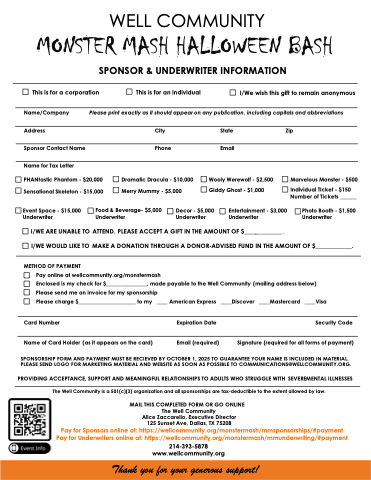 Pay for Sponsors online at: https://wellcommunity.org/monstermash/mmsponsorships/#payment Pay for Underwriters online at: https://wellcommunity.org/monstermash/mmunderwriting/#payment