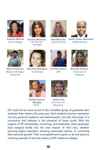 ISF could not be more proud of the incredible group of graduates who achieved their dreams this past year. Each student’s journey represents not only personal resilience and determination, but also the power of a community that believes in the potential of foster youth. With the support of ISF scholarships, mentoring, and leadership, these graduates have stepped boldly into the next chapter of their lives, whether pursuing higher education, entering meaningful careers, or continuing their personal growth. Their accomplishments inspire us all and stand as a shining example of why the mission of ISF matters so deeply.