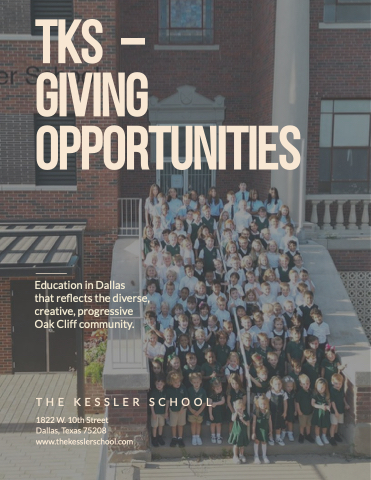 TKS GIVING OPPORTUNITIES Education in Dallas that re ects the diverse, creative, progressive Oak Cliff community. THE KESSLER SCHOOL 1822 W. 10th Street Dallas, Texas 75208 www.thekesslerschool.com