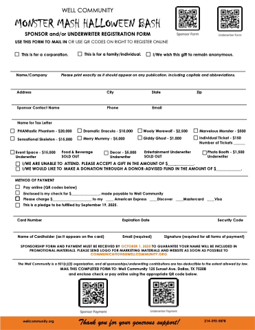 SPONSORSHIP FORM AND PAYMENT MUST BE RECEI VED BY OCTOBER 1, 2025 TO GUARANTEE YOUR NAME WILL BE INCLUDED IN PROMOTIONAL MATERIALS. PLEASE SEND LOGO FOR MARKETING MATERIALS AND WEBSITE AS SOON AS POSSIBLE TO COMMUNICATIONS@WELLCOMMUNITY.ORG