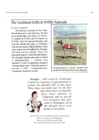 T H E S L O U G H I R E V I E W 8 7 Above from Terri Campbell (Scottish Deerhounds) Below from Sue Oace (Whippets) About the NOTRA Nationals 1998 The Gazehound Sprinter May/June 1998