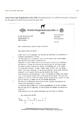 T H E S L O U G H I R E V I E W 1 0 4 Letter from Inge Engelhardt to the VDH, Westfalendamm 174, 4600 Dortmund 1, Mixing of the Sloughi and Saluki breeds dated 18 April 1991