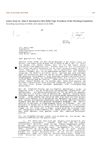 T H E S L O U G H I R E V I E W 1 0 5 Letter from Dr. John E. Burchard to Mrs Helly Vogt, President of the Working Committee Breeding Questions & SHSB, SKG dated 23.12.1986.