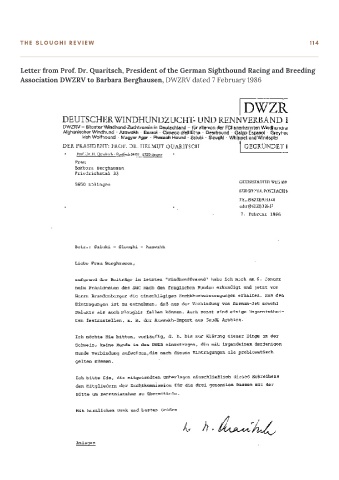 T H E S L O U G H I R E V I E W 1 1 4 Letter from Prof. Dr. Quaritsch, President of the German Sighthound Racing and Breeding Association DWZRV to Barbara Berghausen, DWZRV dated 7 February 1986