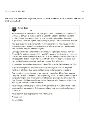 T H E S L O U G H I R E V I E W 1 1 5 Gervais Cazin, breeder of Magistère, about Ata, born in Tunisia 2009, comment February 12 2022 on Facebook