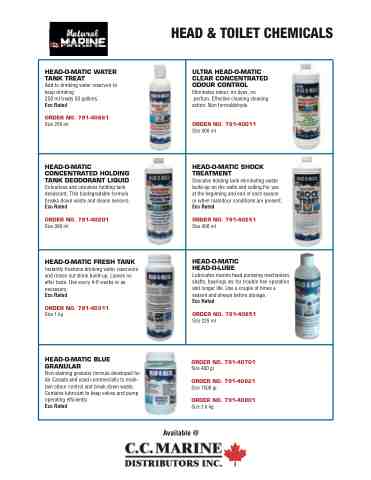 HEAD-O-MATIC CONCENTRATED HOLDING TANK DEODORANT LIQUID Colourless and odouless holding tank deodorant. This biodegradable formula breaks down waste and cleans sensors. Eco Rated