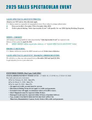 STOCK ORDER PAYMENT TERMS UP TO - 1/3 MAY 10, 1/3 JUNE 10, 1/3 JULY 10 /2026 Pay early and you save even more.