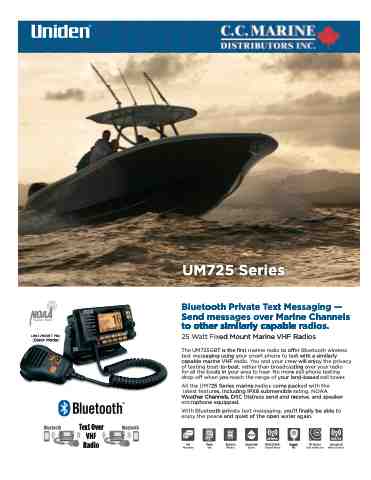 The UM725GBT is the first marine radio to offffffer Bluetooth wireless text messaging using your smart phone to text with a similarly capable marine VHF radio. You and your crew will enjoy the privacy of texting boat-to-boat, rather than broadcasting over your radio