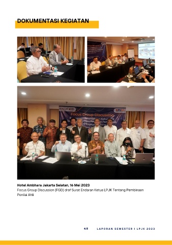 DOKUMENTASI KEGIATAN Hotel Ambhara Jakarta Selatan, 16 Mei 2023 Focus Group Discussion (FGD) draf Surat Endaran Ketua LPJK Tentang Pembinaan Penilai Ahli 4 5 L A P O R A N S E M E S T E R I L P J K 2 0 2 3