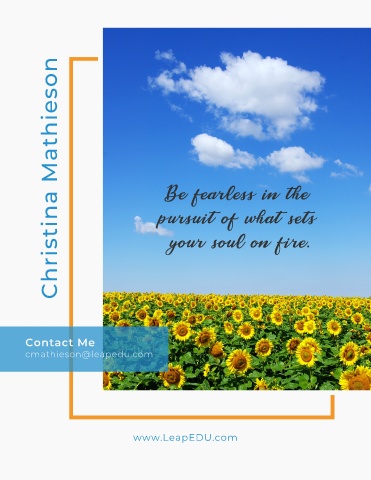Christina Mathieson B e f e a r l e s s i n t h e p u r s u i t o f w h a t s e t s y o u r s o u l o n f i r e. Contact Me cmathieson@leapedu.com www.LeapEDU.com