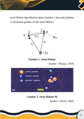 atom Helium diperlihatkan dalam Gambar 1 dan pada Gambar 2 merupakan gambar 3d dari atom Helium. Gambar 1. Atom Helium Sumber : (Siregar, 2018) Gambar 2. Atom Helium 3d Sumber : (Zeilik, 2002) 10