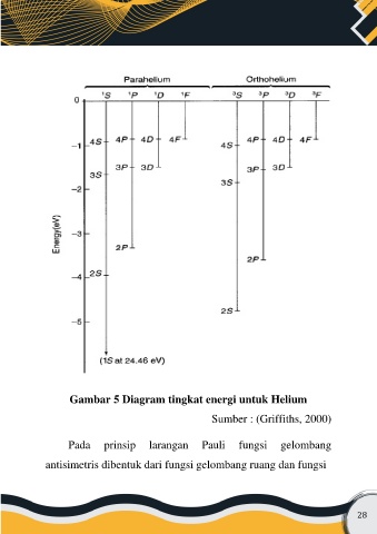 Gambar 5 Diagram tingkat energi untuk Helium Sumber : (Griffiths, 2000) Pada prinsip larangan Pauli fungsi gelombang antisimetris dibentuk dari fungsi gelombang ruang dan fungsi 28
