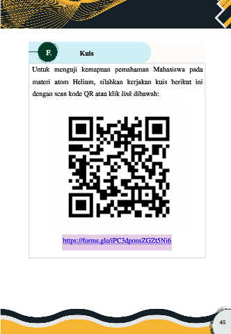 F. Kuis Untuk menguji kemapuan pemahaman Mahasiswa pada materi atom Helium, silahkan kerjakan kuis berikut ini dengan scan kode QR atau klik link dibawah: https://forms.gle/iPC3dponsZGZt5Ni6 45
