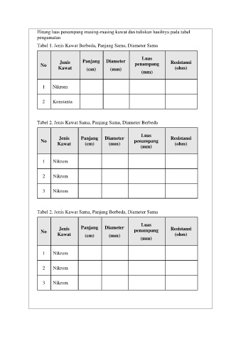 Hitung luas penampang masing-masing kawat dan tuliskan hasilnya pada tabel