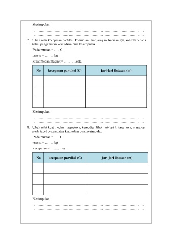 7. Ubah nilai kecepatan partikel, kemudian lihat jari-jari lintasan nya, masukan pada