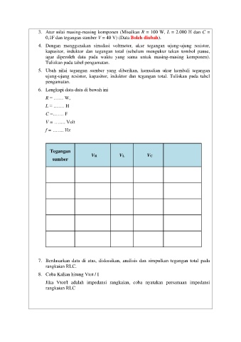 ujung-ujung resistor, kapasitor, induktor dan tegangan total. Tuliskan pada tabel