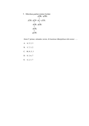 5. Diberikan gambar struktur berikut: Atom C primer, sekunder, tersier, & kuartener ditunjukkan oleh nomor ….. A. 6, 5, 2, 3 B. 1, 7, 3, 2 C. 10, 9, 5, 3 D. 8, 3, 6, 7 E. 4, 2, 3, 7