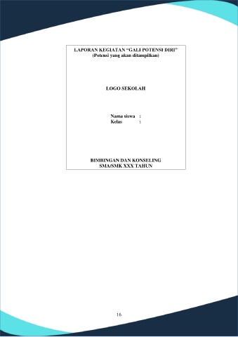 LAPORAN KEGIATAN “GALI POTENSI DIRI” (Potensi yang akan ditampilkan) LOGO SEKOLAH Nama siswa : Kelas : BIMBINGAN DAN KONSELING SMA/SMK XXX TAHUN 16