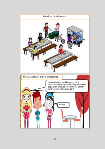 Contoh distribusi langsung. Mereka istirahat sejenak di tempat santai. Kalau distribusi semi langsung yaitu distribusi melalui perantara yang merupakan bagian dari produsen. Contohnya, apakah kalian pernah naik kereta api? Pernah 39