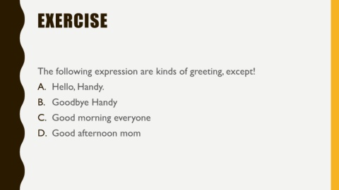 EXERCISE The following expression are kinds of greeting, except! A. Hello, Handy. B. Goodbye Handy C. Good morning everyone D. Good afternoon mom