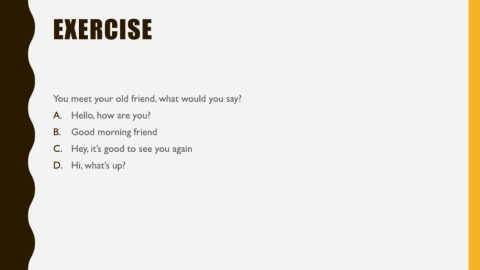 EXERCISE You meet your old friend, what would you say? A. Hello, how are you? B. Good morning friend C. Hey, it’s good to see you again D. Hi, what’s up?